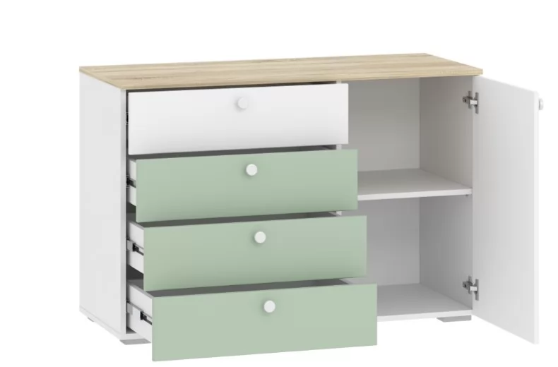 Комод НМ 041.39_Комод Банни прекрасный выбор для интерьера в Скандинавском стиле.Три удобных выдвижных ящика и боковое отделение с полками станут вместительным местом для хранения белья, предметов одежды и аксессуаров. Выдвижные ящики оснащены шариковыми направляющими полного выдвижения, равномерно распределяют вес содержимого и обеспечивают плавный бесшумный ход ящика.