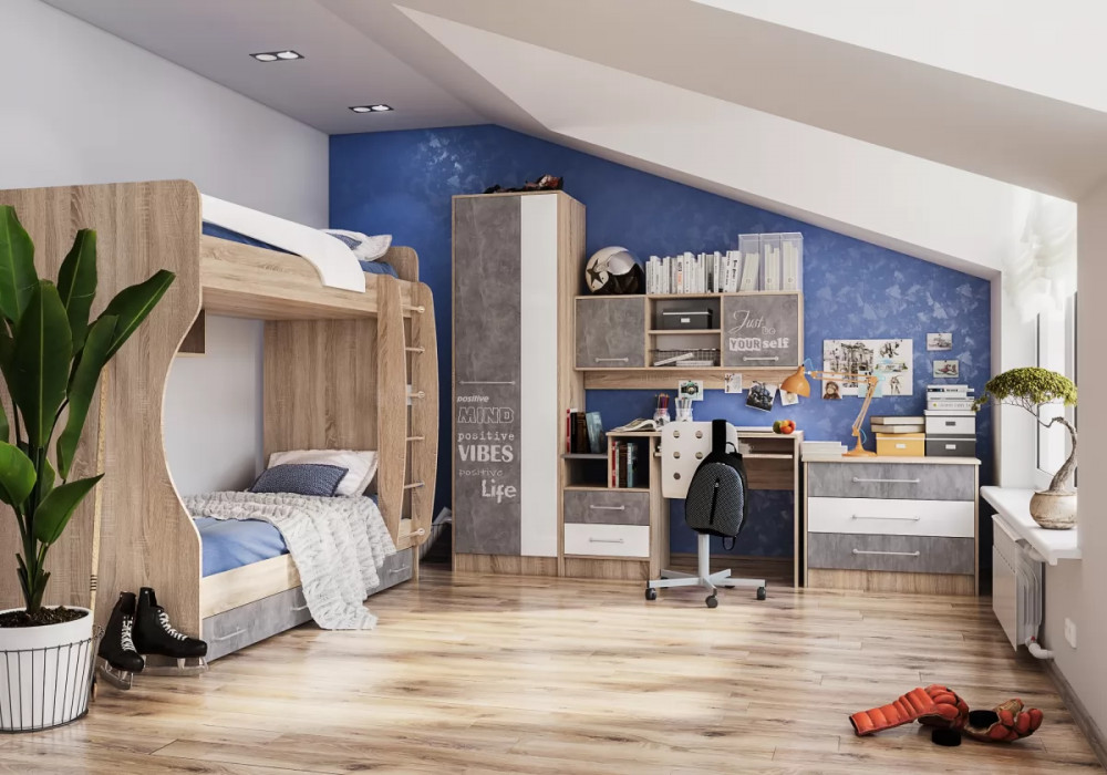 — Колибри Лофт – гарнитур с ультрасовременными фасадами «Ателье Светлое», декорированными белым принтом, нанесенным методом фотопечати. Материал для фасадов «Акрил Белый»– уникальные высокоглянцевые панели HIGH GLOSS. Спальня комплектуется стильной металлической фурнитурой.