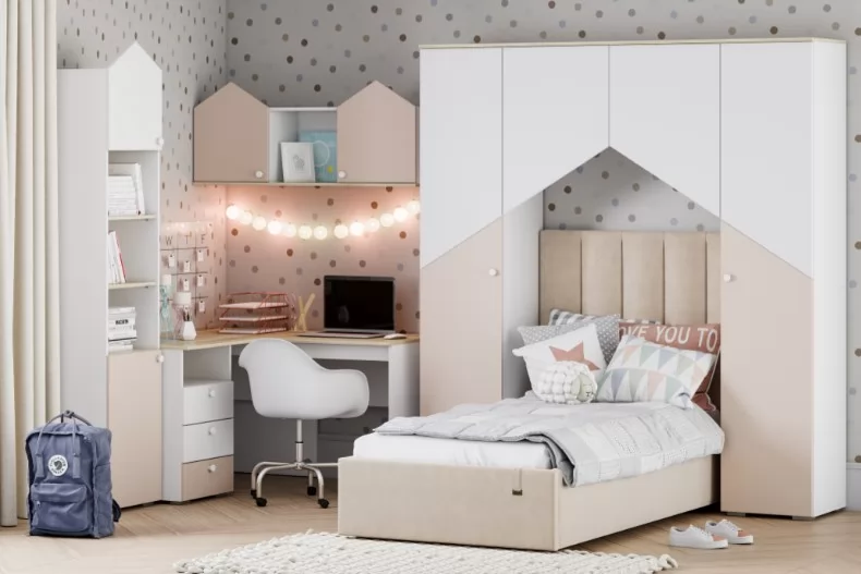 Коллекция  «Банни» сочетает в себе актуальный дизайн и высокую функциональность. Практичная композиция в светлых тонах и цветными элементами фасадов станет отличным вариантом для меблировки современной молодежной комнаты. В данном комплекте: кровать с бельевыми ящиками, письменный стол  с тремя выдвижными ящиками и шкаф с двумя полками и штангой для одежды. Максимально функциональные модули выполнят задачу эргономичного обустройства комнаты.