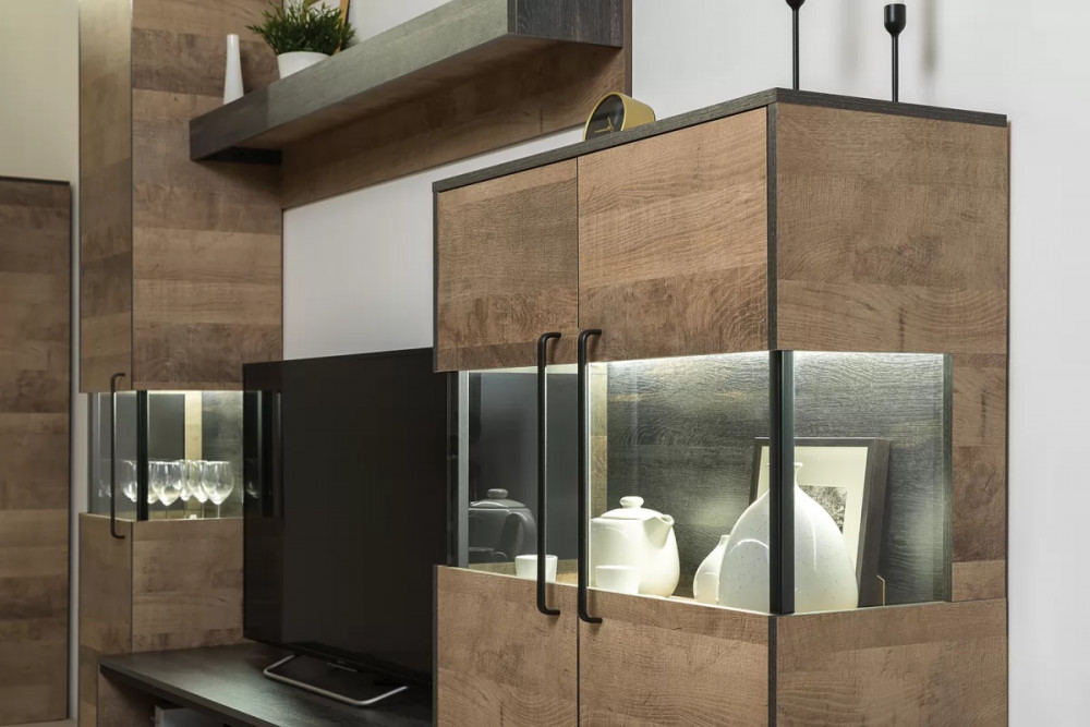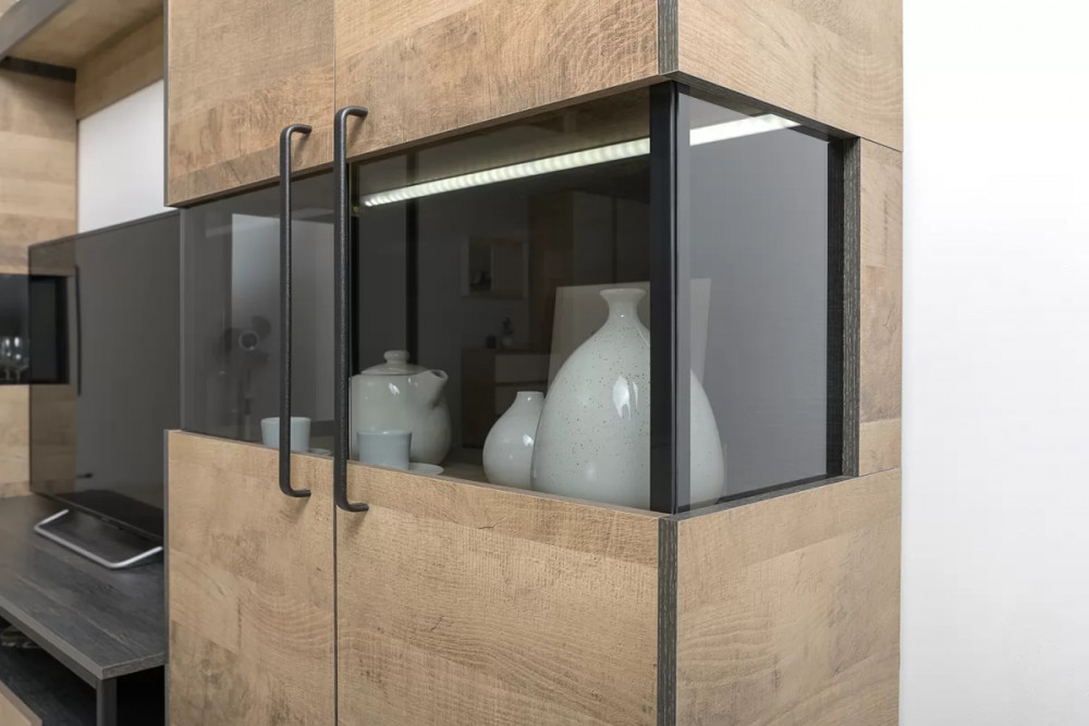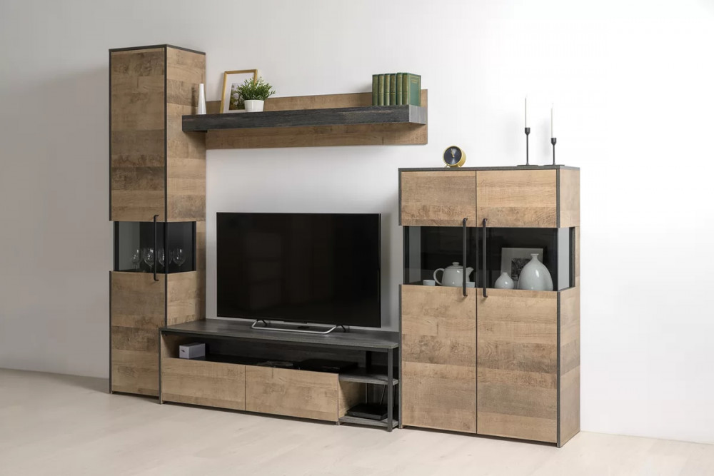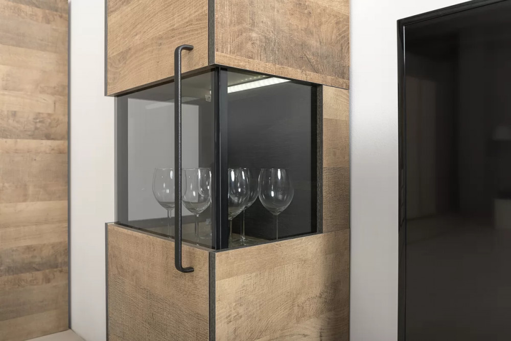 Индустриальная гостиная в стиле лофт. Все петли и направляющие оснащены доводчиками, что несомненно сделает ежедневное пользование приятным и безопасным. Металлические стойки с регулируемыми опорами делают эту мебель надёжной, аутентичной и функциональной. Лицевая фурнитура с тем же покрытием придаёт мебели индустриальную эстетику. Светодиодная подсветка в витринах с тонированным стеклом — эффектно подчёркивает аксессуары.
