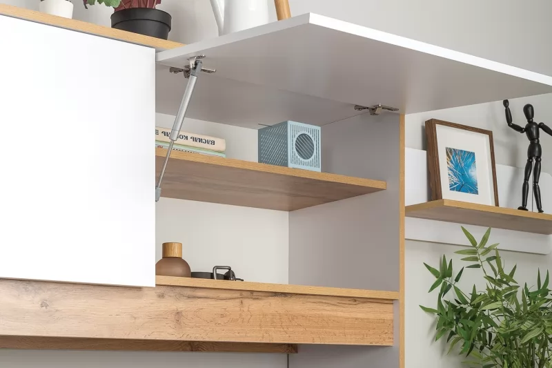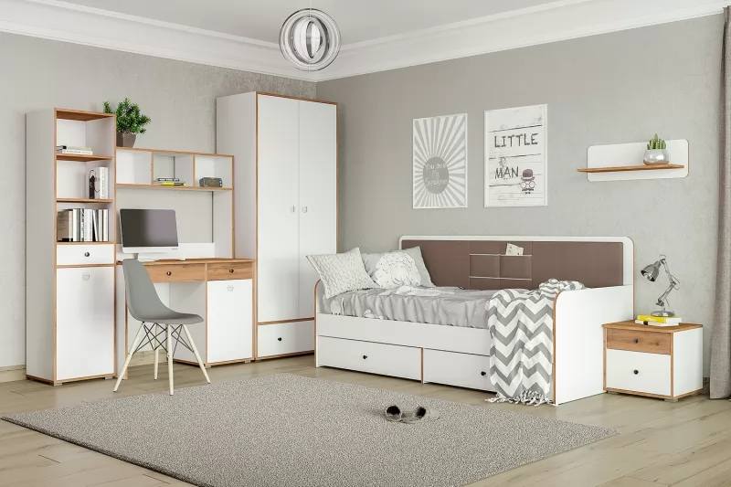 Светлая и аккуратная молодёжная мебель. Основой модульной системы является кровать-трансформер. Её столешница имеет постоянный горизонт, то есть при трансформации не нужно убирать вещи. Система хранения с подъёмными фасадами значительно расширяет функционал.