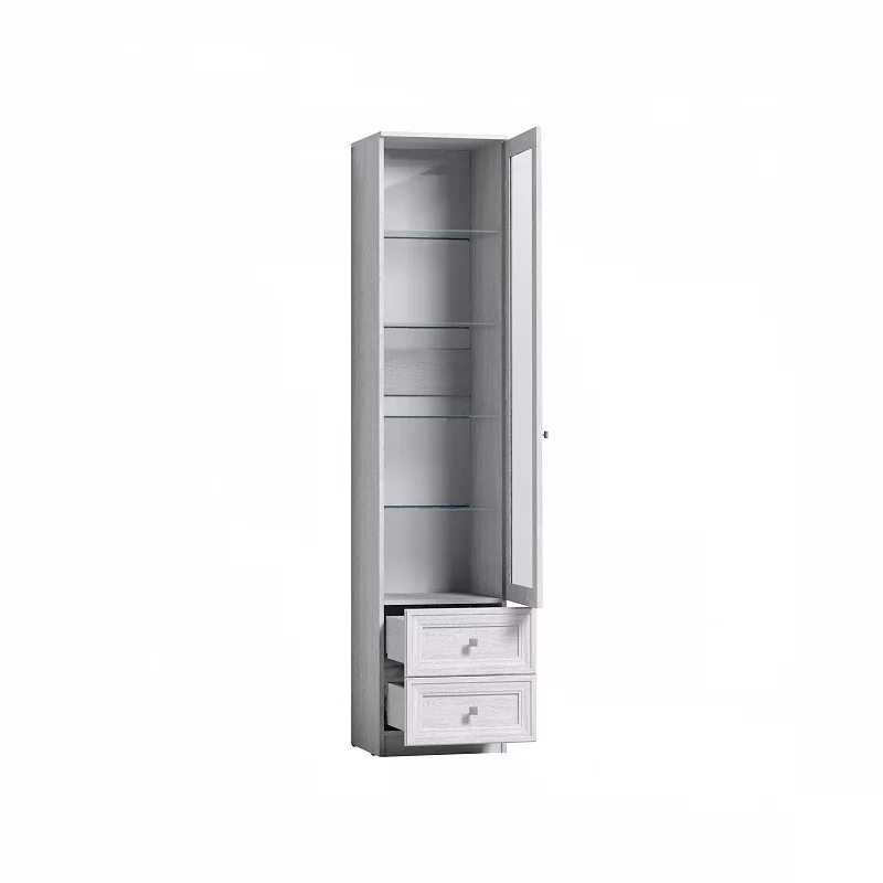 Элегантный шкаф для посуды PAOLA 13 станет украшением любой гостиной. Контрастное серое стекло в сочетании с белым декором Ясень Анкор светлый создаст эффект легкости и прозрачности в комнате, а рамочные фасады с маленькими ручками придадут мебели красоты и изысканности. На регулируемых по высоте полках разместите красивую посуду, антикварные вещи и сувениры, привезенных из дальних стран. Стеклянный фасад шкафа защитит милые сердцу вещи от солнечного света и пыли. Два выдвижных ящика хорошо подойдут для хранения столовых приборов и скатертей. Ящики оснащены шариковыми направляющими полного выдвижения и способны выдержать нагрузку до 15 кг. Сборка шкафа для посуды универсальная — его можно собрать как на правую, так и на левую сторону.