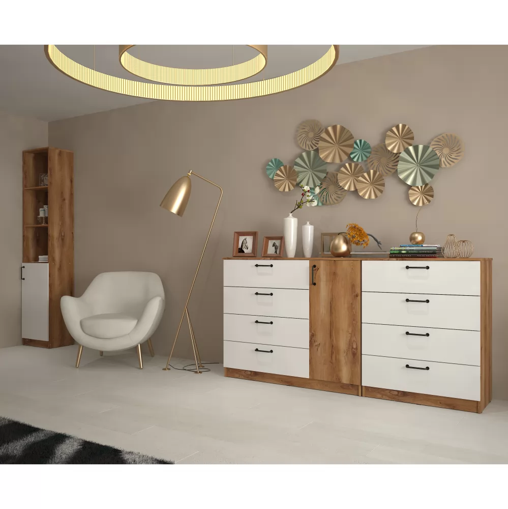 Стеллаж Сеул совмещает в себе 2 функции - открытые полки для декора или часто необходимых вещей и практичные закрытые полки - для того, что Вы не хотите показывать в интерьере.