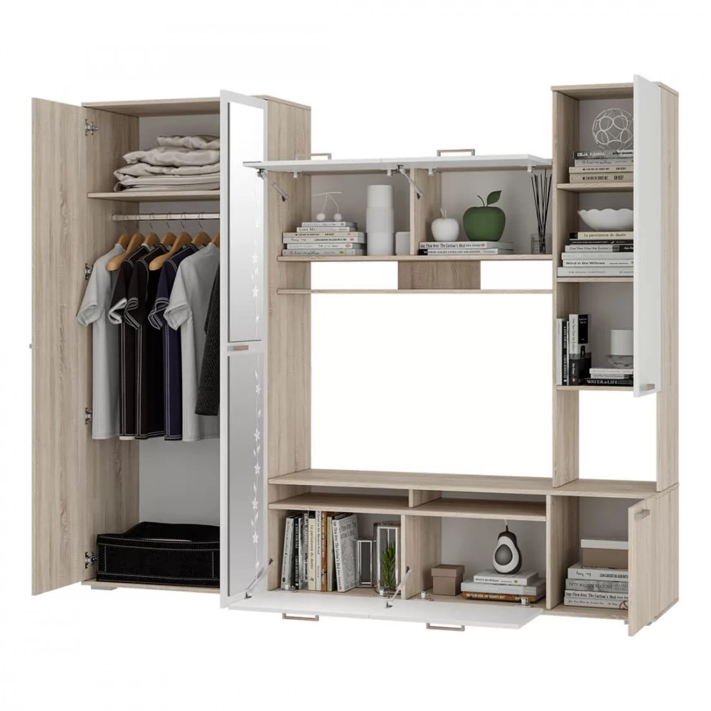 - состоит из встроенного двустворчатого распашного шкафа, пенала, ТВ-зоны и множества открытых и закрытых полок.