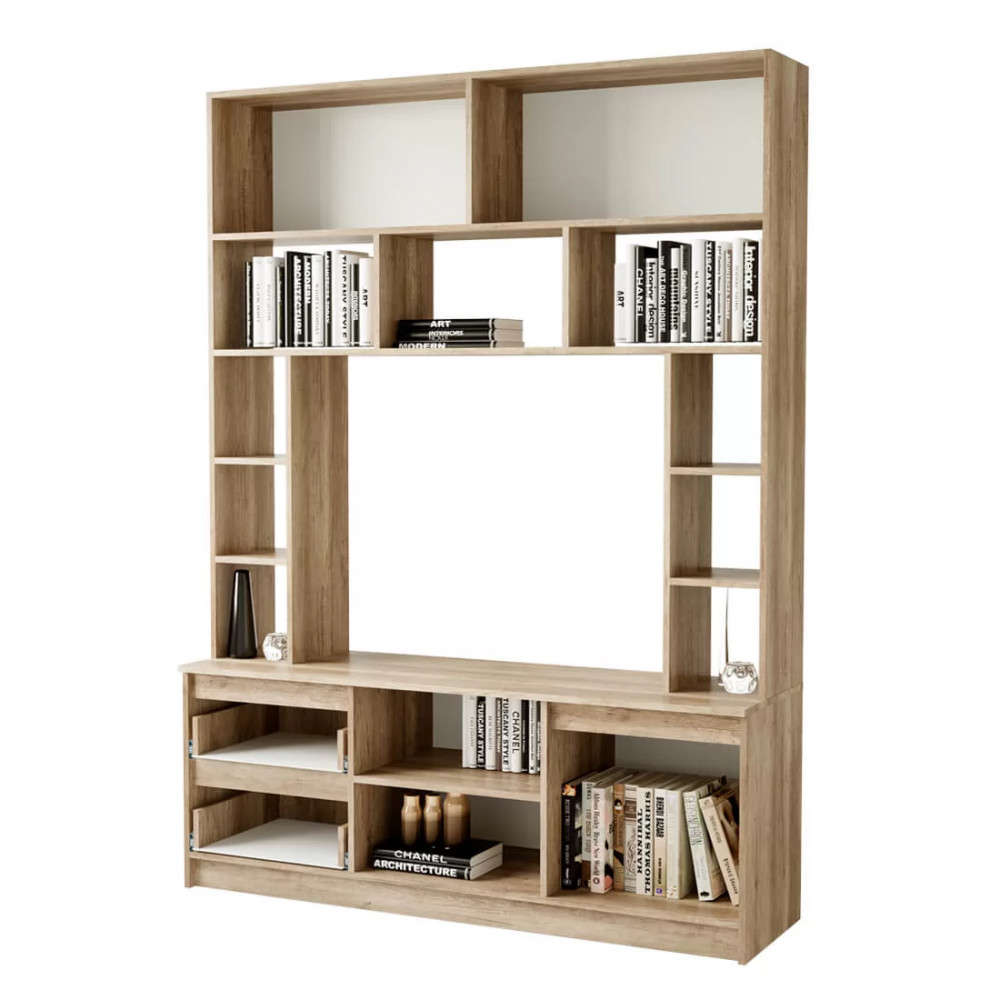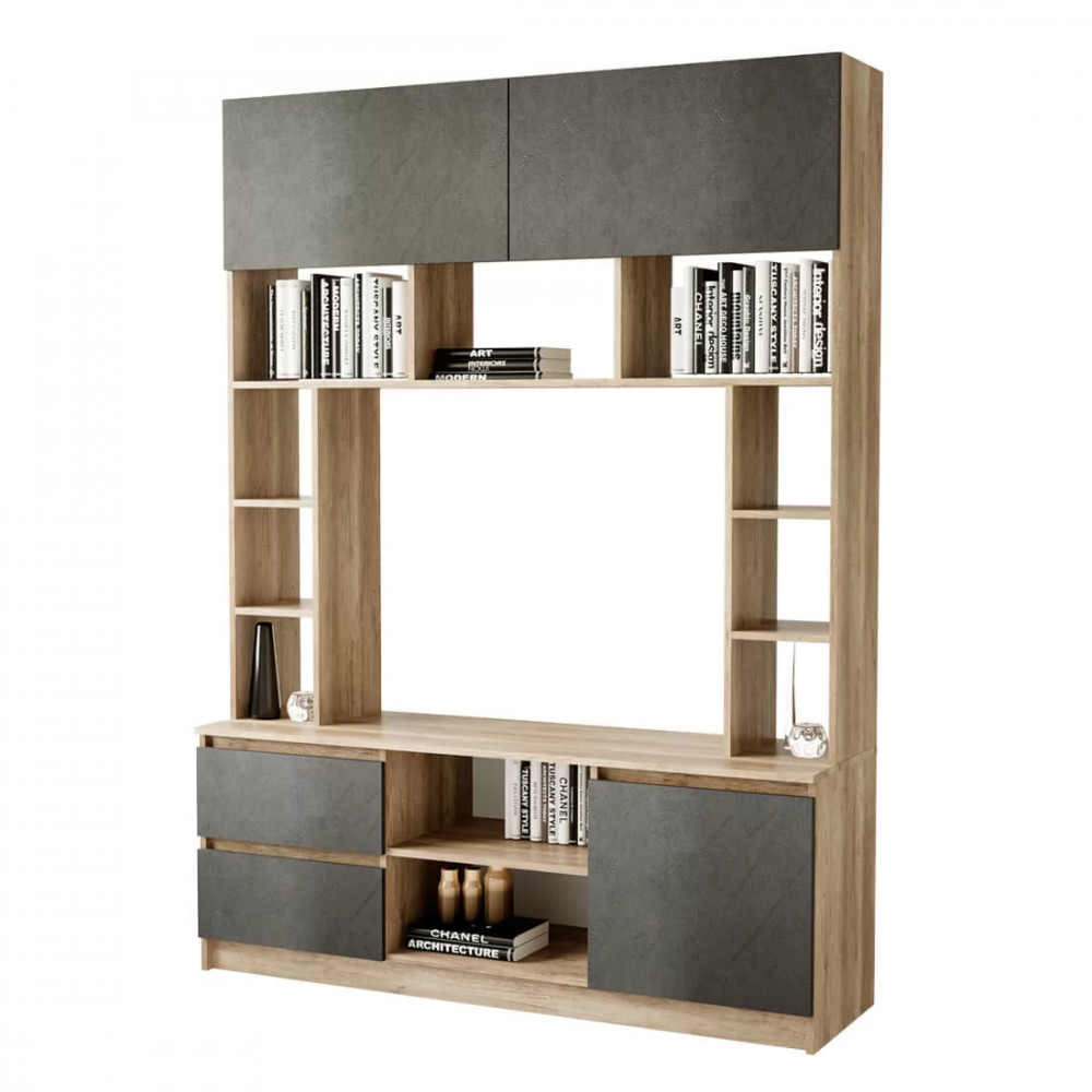 -модель содержит все необходимые зоны для хранения вещей, предметов декора, техники или сувениров, -на столешнице разместиться телевизор, -изделие выполнено из ЛДСП в теплом цвете дуб каньон, а фасады распашных дверок и выкатных ящиков изготовлены в темном цвете, -такое сочетание придает гостиной стиля и делает ее очень современной.
