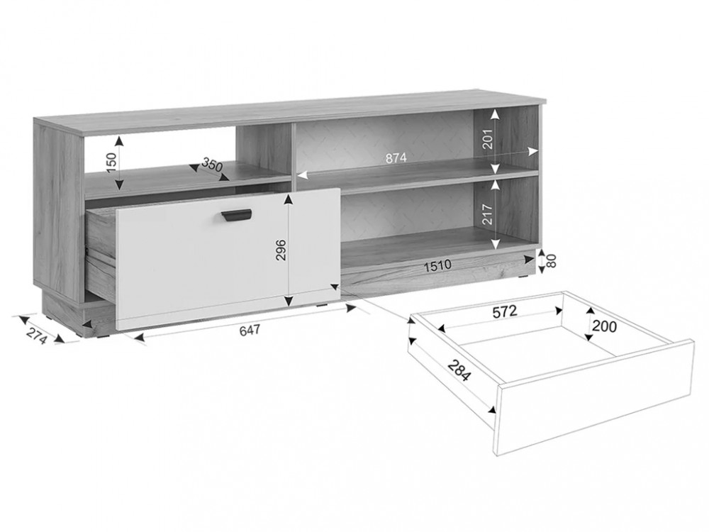 Состоит из: тумбы с дверями, выдвижного ящика и открытой секции.