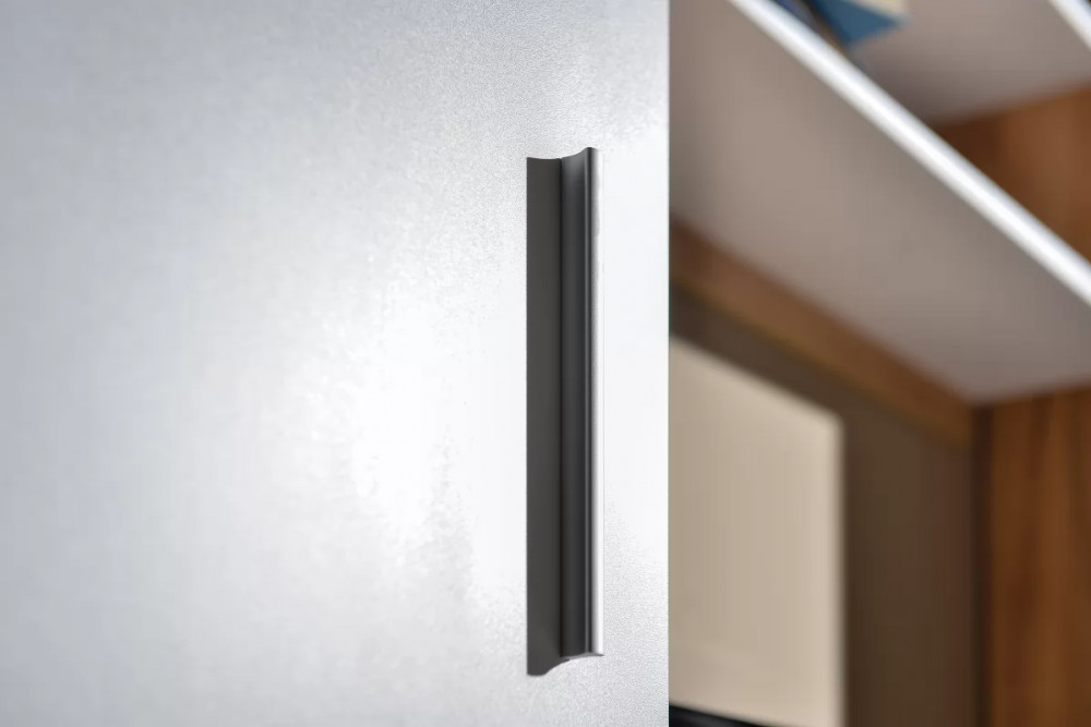 Глянцевые фасады модулей из МДФ с уникальной фрезеровкой и фасками. Фасады ТВ тумбы открываются за край, а фасады пеналов - за металлическую ручку. Металлические ручки цвета "Никель жемчужный". Глубина пеналов и тумбы увеличена для удобства хранения.