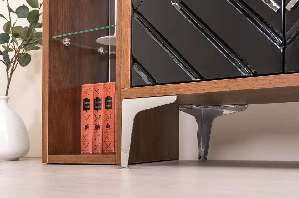 Тумба ТВ из модульной коллекции "Муар" - компактное и стильное решение для гостиной. Глянцевые фасады и древесный декор эффектно дополняются глянцевой металлической фурнитурой. Диагональный рисунок фрезеровки делает модель современной и динамичной.