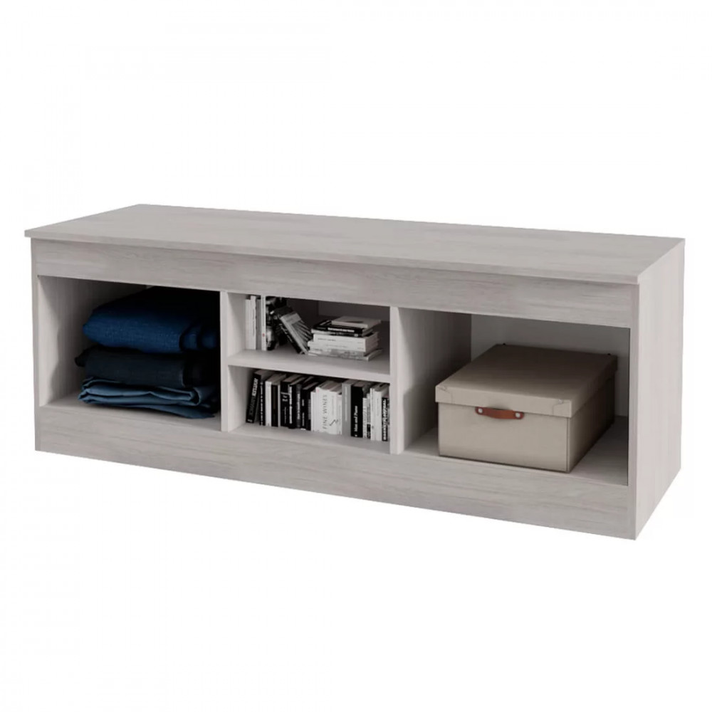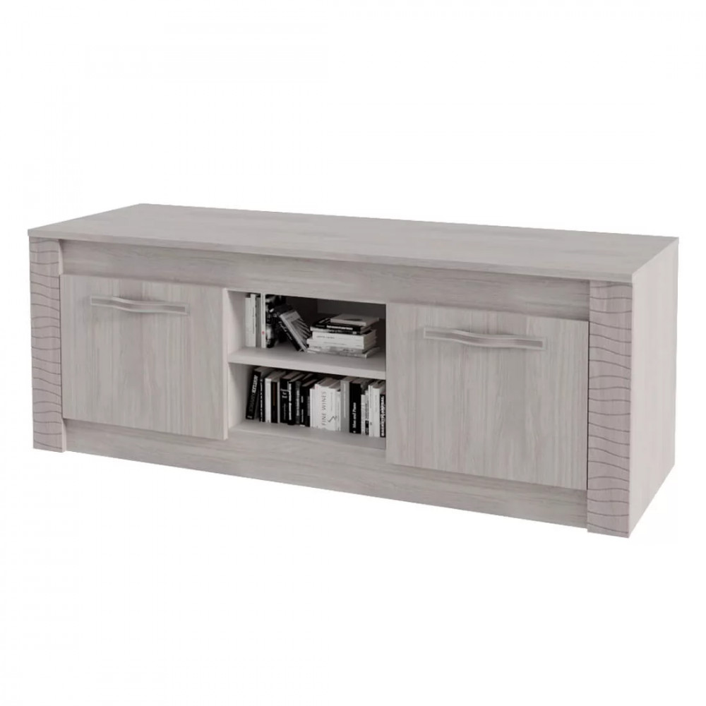 -она изготовлена из высококачественной ЛДСП цвета белого ясеня и имеет декоративную отделку фасадов из МДФ. Изделие -состоит из двух центральных открытых ниш, а также полок, спрятанных за распашными дверцами. На столешнице вы сможете -разместить телевизор, а в зонах хранения – необходимые вещи и технику.