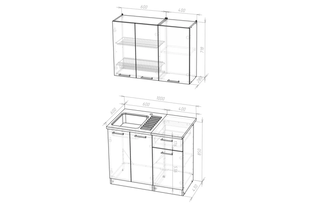 Мойки, смесители и посудосушители в комплекты гарнитуров не входят.