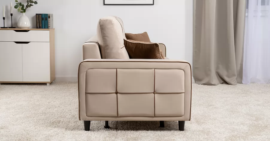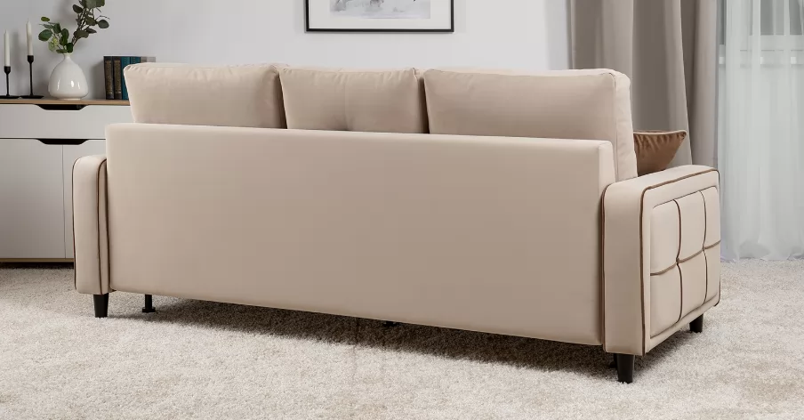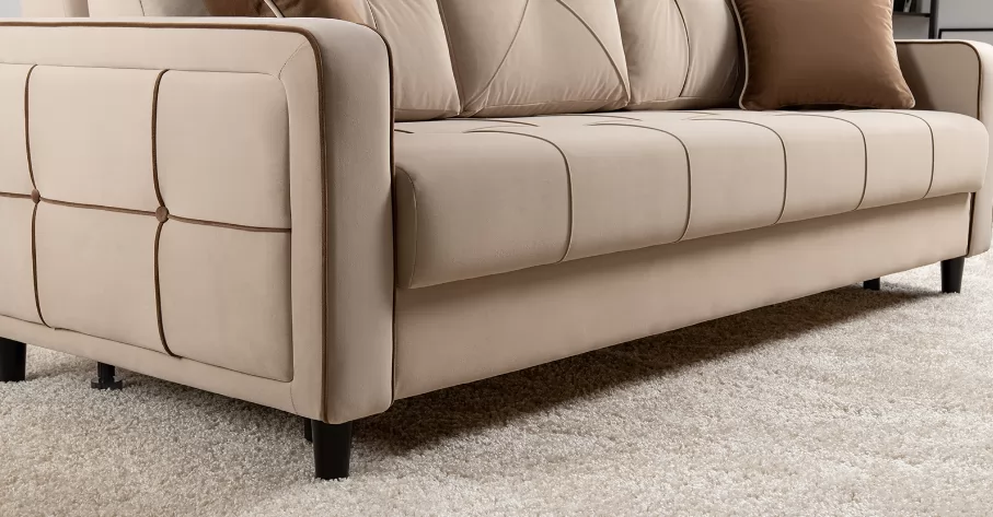 ДВПоОснование сиденья: ППУ на блоке плоских пружин "змейка"Приспинные подушки, шт:  3Съемные чехлы приспинных подушек:  естьДекоративные подушки, шт:  2Наполнитель подушек:  крошка ППУ и полиэфирное волокно «шарики»Материал опор:  лакированное деревоВысота опор (мм):  120