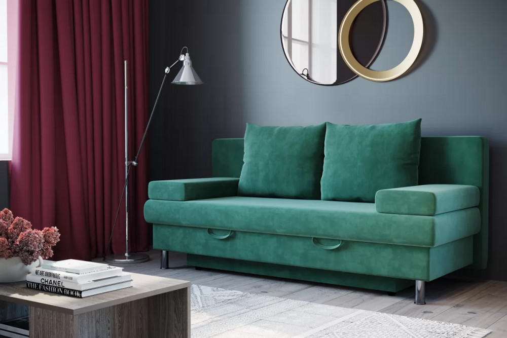 Диван оснащен декаративными накладками, которые обеспечивают дополнительную поверхность и малогабаритность изделия,при необзходимости подлокотники можно убрать,для использования полноценного места.