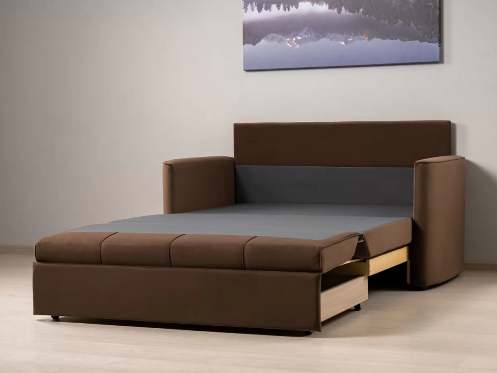 Габаритысложенный (Д x Г х В, мм): 1450 x 800 x 840разложенный (Д x Г х В, мм): 1450 x 2000 x 770спальное место (Д x Ш, мм): 1950 x 1200высота посадки (мм): 460глубина сиденья (мм): 650высота спинки (мм): 450высота подлокотника от сиденья (мм): 120максимально допустимая нагрузка: 80 кгМеханизм трансформацииВыкатной с гнутоклееными латамиБельевой ящикестьодно отделениеразмер отделения (Д x Ш, мм):  1100 x 628 x 100Варианты исполнения6 артикуловсочетание тканей только как на фотоМатериалыосновная ткань: Киви (велюр) / Макс (велюр)выполняется в тканях: Макс 235 (коричневый)каркас:
