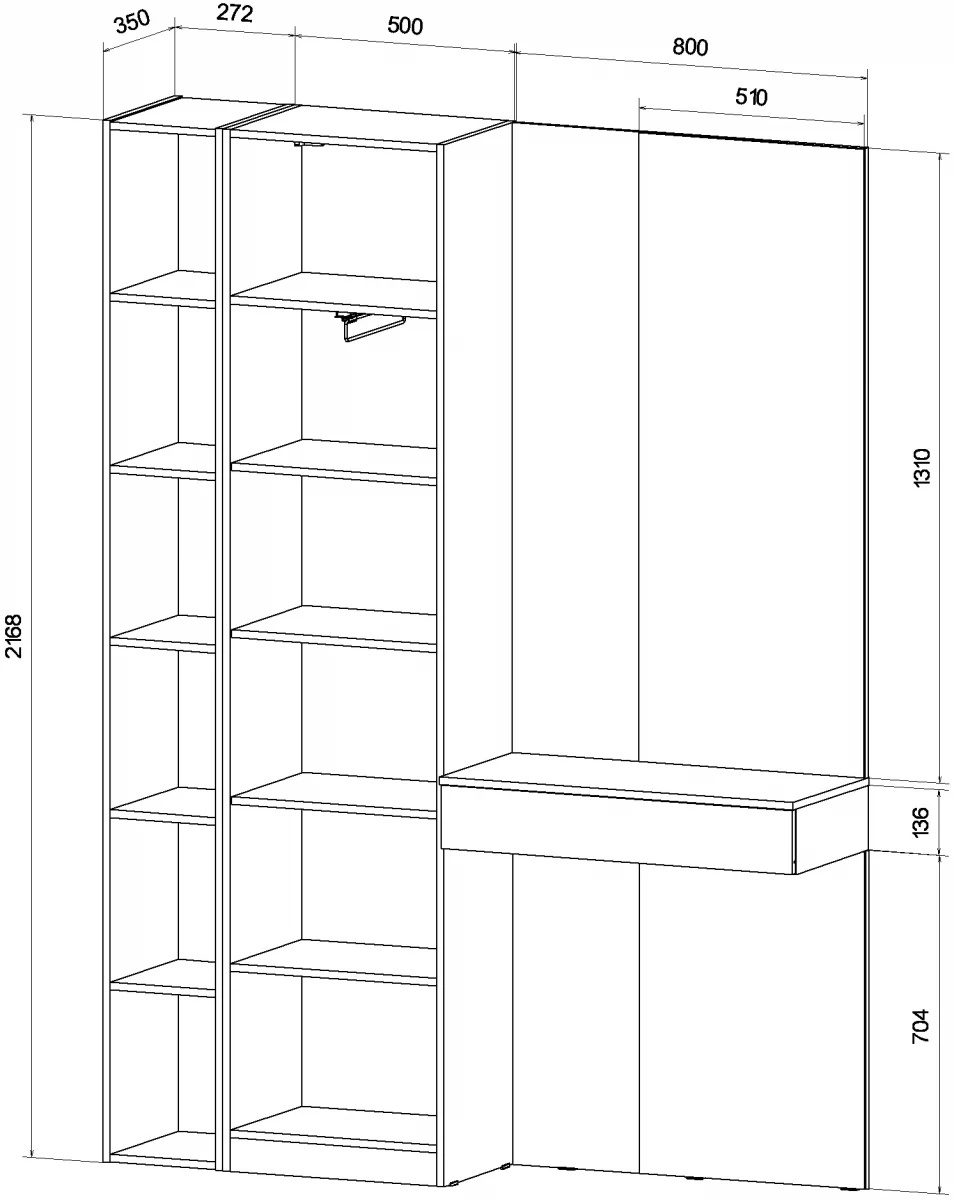 • Габариты: 1572 (ширина) х 350 (глубина) х 2168 (высота) мм.