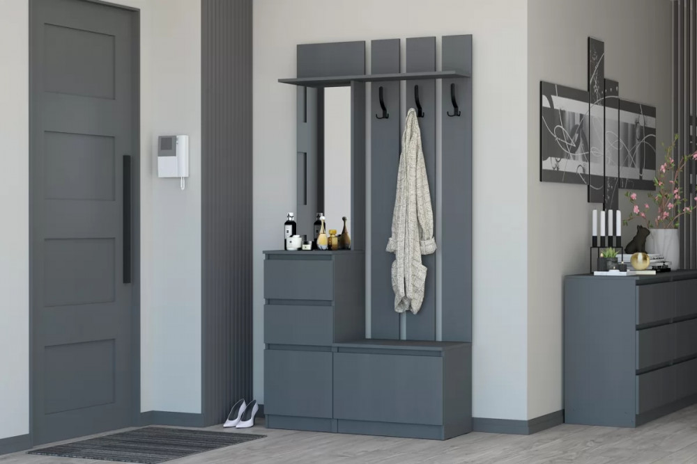 Прихожая входит в модульную систему с разнообразным набором модулей: шкафы и кровати разных размеров, письменные столы, комоды, тумбы под ТВ. Благодаря этому можно оформить интерьер всей квартиры в одном стиле.