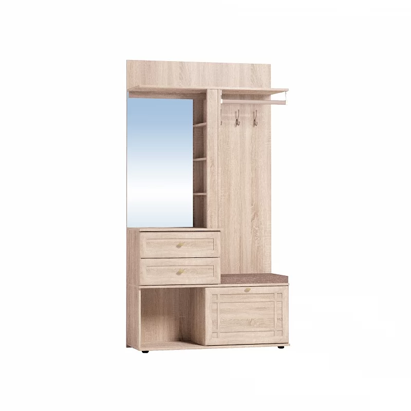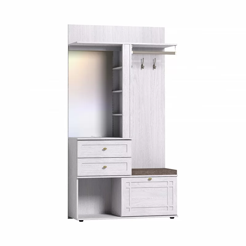 Это находка для маленькой прихожей. В небольшом по габаритам модуле сочетается всё необходимое: вешалки и крючки, полки и отделения за глухими фасадами, предусмотрено зеркало с подсветкой. Стационарная штанга на подвесах добавит вешалке Шкафа МЦН функциональности. Штанга на подвесах выдерживает нагрузку до 25 кг. Встроенная светодиодная подсветка включается при помощи аккуратного кнопочного выключателя. В модуле Шкаф МЦН предусмотрено место для хранения коробок и домашней обуви — просторная открытая ниша и ниша с полочкой за откидной дверцей на шарнирах. Дверца дополнительно фиксируется при закрывании магнитной защелкой. Регулируемые опоры помогут компенсировать неровный пол в прихожей. Ящик под аксессуары и косметику оснащен шариковыми направляющими полного выдвижения, что увеличивает полезную площадь ящика. Мягкое сидение, которое входит в комплектацию модуля, позволит обуваться с комфортом и сэкономить место в прихожей. Сборка Шкаф МЦН универсальная — его можно собрать как на правую, так и на левую сторону.