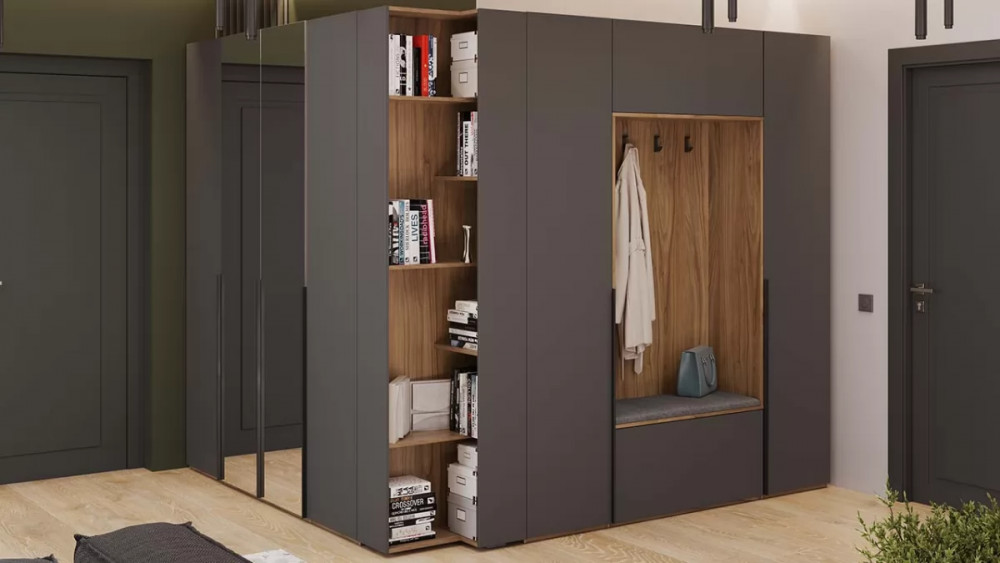 Назначение: Мебель для хранения Зеркало: Да Гарантийный срок: 24 месяца Комната использования: Прихожая Материал кромки каркаса: ПВХ Стиль: Современный Тип: Гарнитур в прихожую Расположение: Напольный, навесной Тип направляющих ящиков: Скрытого монтажа с доводчиком Наполнение: Полки ЛДСП, штанга, ящик Материал каркаса: ЛДСП Материал ручек: Металл Производство: Россия Габаритная высота: 2 171 Модель: Порто (прихожая) Срок службы: 8 лет Материал фасада: МДФ, пленка ПВХ, ЛДСП, зеркало Оттенок: Коричневый, Серый Цвет: Яблоня Беллуно, Графит софт Цвет каркаса: Яблоня Беллуно Цвет фасада: Графит софт Оттенок каркаса: Коричневый Оттенок фасада: Серый Тип сборки: Универсальный левый/правый Наличие механизма раскладки: Нет Наличие спального места: Нет