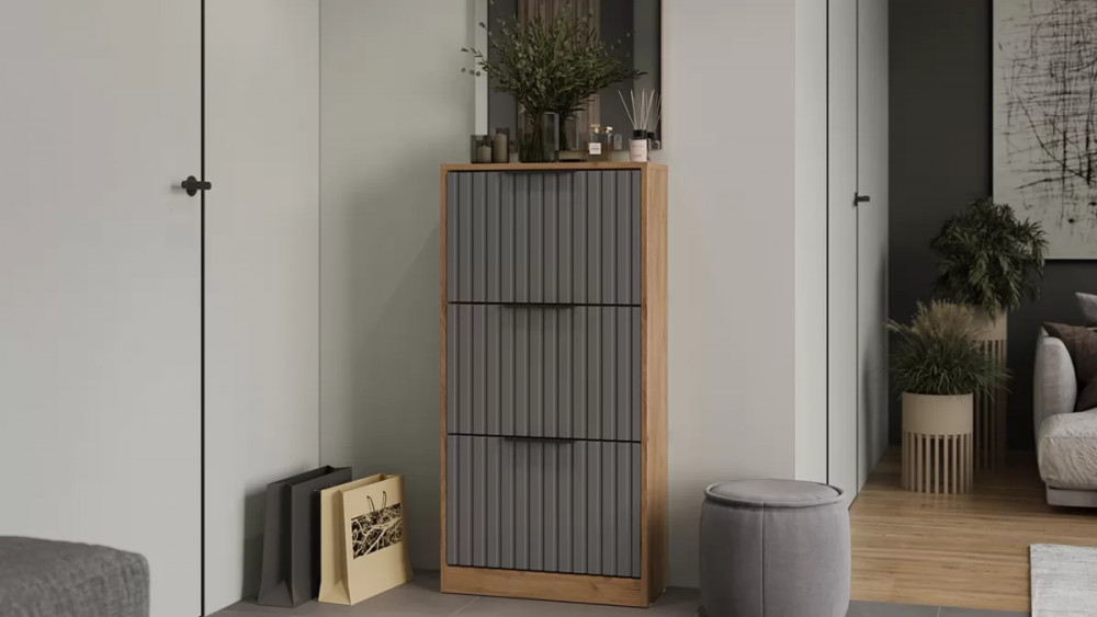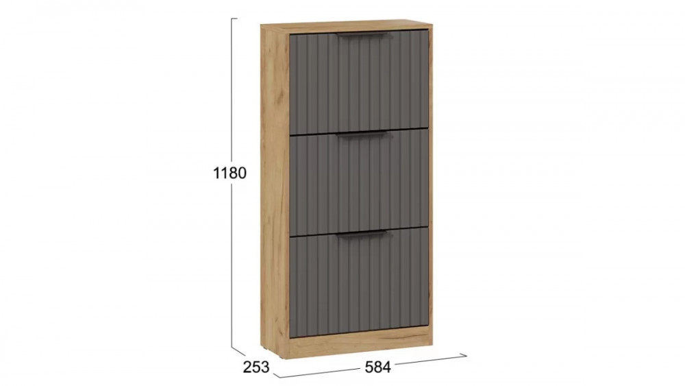 Назначение: Мебель для хранения Количество дверей: 2 Зеркало: Нет Гарантийный срок: 24 месяца Комната использования: Прихожая Материал кромки каркаса: ПВХ Стиль: Современный Тип: Тумба для обуви Расположение: Напольный Тип направляющих ящиков: Шариковые Наполнение: Ящик, Обувница Материал каркаса: ЛДСП Направление открытия двери: Вниз Материал ручек: Металл Дополнительная информация: Материал механизма обувницы (боковых стенок ящиков) - пластик. Производство: Россия Габаритная ширина: 584 Габаритная высота: 1 180 Форма предмета: Прямоугольный Габаритная глубина: 253 Количество ящиков: 3 Модель: Хилтон (прихожая) Срок службы: 5 лет Материал фасада: МДФ, пленка ПВХ Оттенок: Коричневый, Серый Цвет: Дуб Крафт золотой, Графит матовый Цвет каркаса: Дуб Крафт золотой Цвет фасада: Графит матовый Оттенок каркаса: Коричневый Оттенок фасада: Серый Наличие механизма раскладки: Нет Наличие спального места: Нет