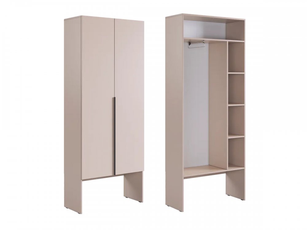 Шкаф оснащен накладными петлями с доводчиком от Боярд, которые обеспечивают плавное и бесшумное закрывание дверей. Выдвижная штанга и отделение с полками предоставляют удобный доступ к одежде, позволяя легко организовать внутреннее пространство.