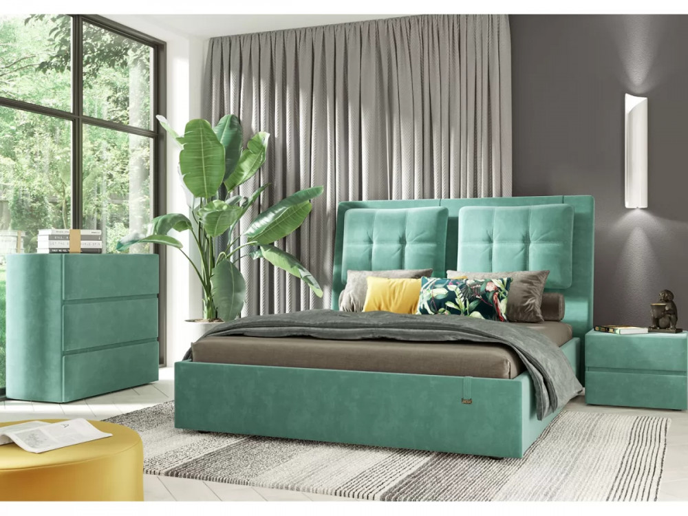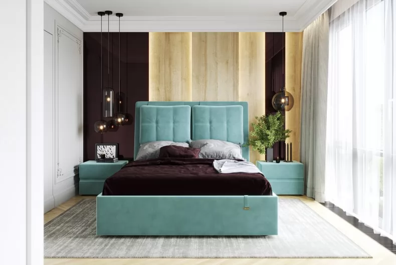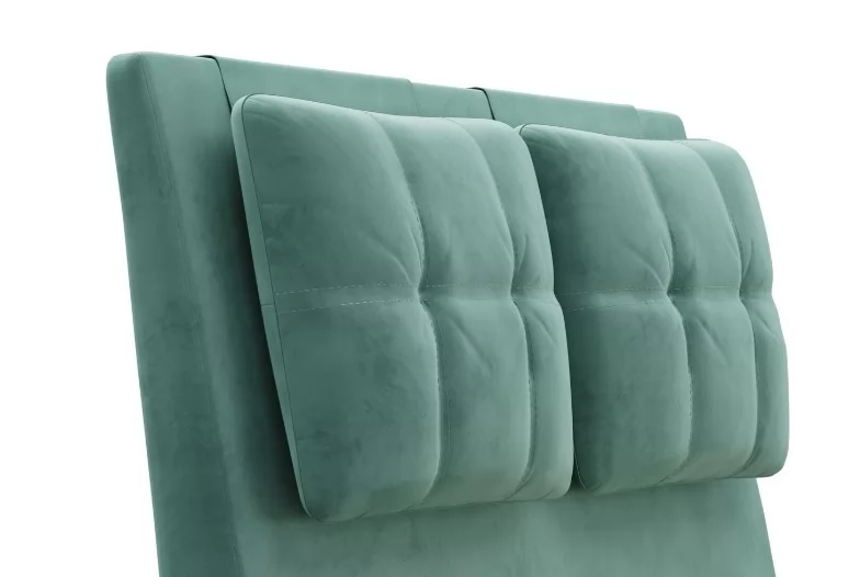 Кровати выполнены в нейтральных и в ярких тканях велюр, что позволяет подобрать подходящий вариант почти под любой интерьер. В качестве декора применяются декоративные подушки на изголовье.