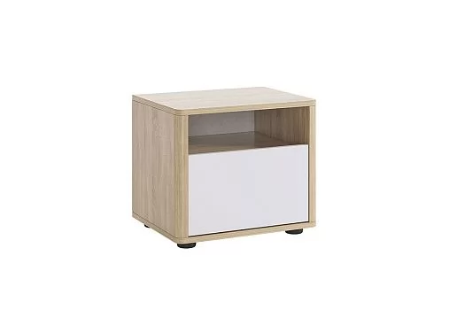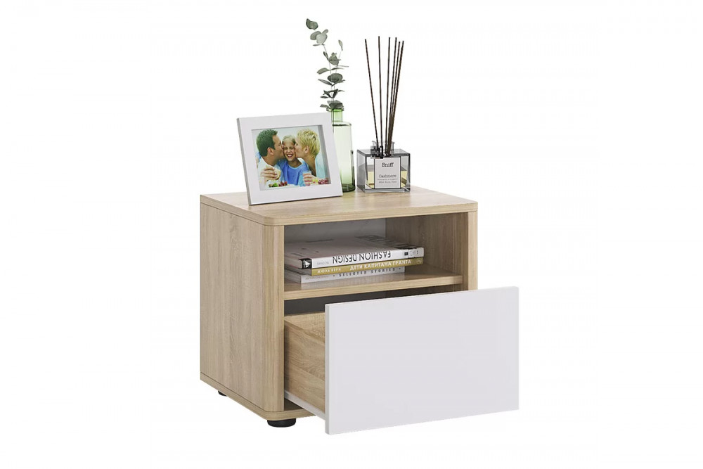 Прикроватная тумба «Зара» дополнит Ваш интерьер и прекрасно подойдет для хранения самых необходимых вещей как в открытой нише, так и в закрытом выдвижном ящике. Отличительной особенностью данной серии являются закругленные углы, которые обеспечат максимальную безопасность в использовании изделий. Принтерный рисунок на фасаде подчеркивает общий стиль коллекции.