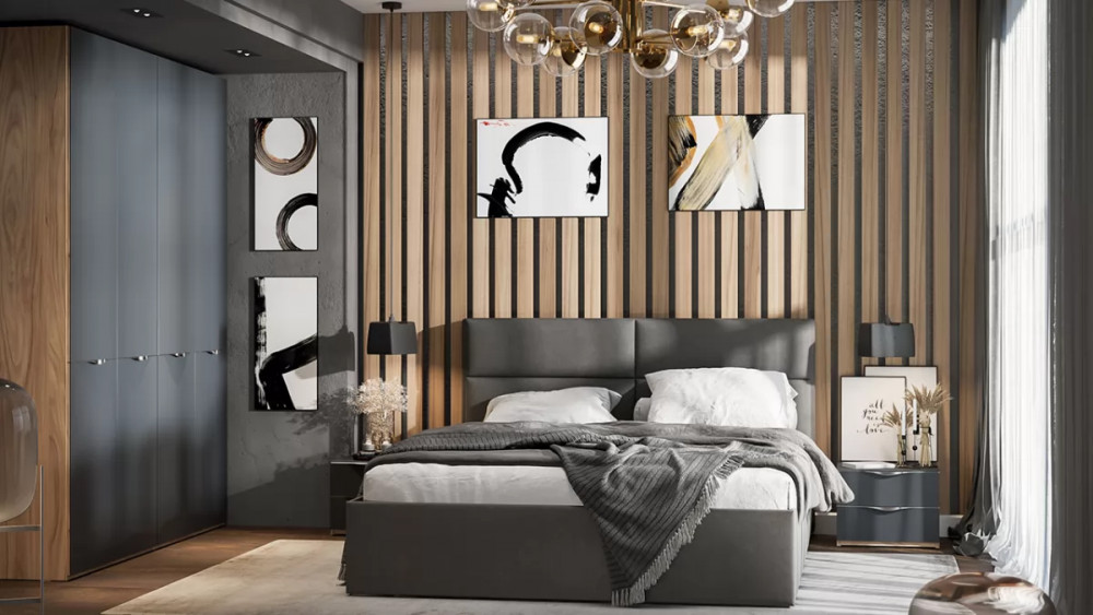Спальный гарнитур «Порто» №2 Яблоня Беллуно, Графит софт, Велюр Confetti Stone