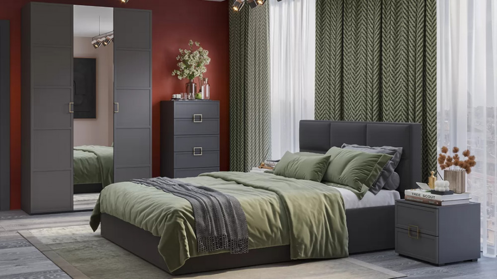 Назначение: Мебель для хранения Комната использования: Спальня Материал кромки каркаса: ПВХ Цвет ручки: Золотой Тип: Спальный гарнитур Тип направляющих ящиков: Шариковые Материал каркаса: ЛДСП Материал ручек: Металл Производство: Россия Габаритная высота: 2 249 Модель: Стелла Материал фасада: МДФ в пленке ПВХ Цвет: Серый вулкан, Фон серый, Велюр Графит Цвет каркаса: Фон серый Цвет фасада: Серый вулкан Наличие механизма раскладки: Нет Наличие спального места: Нет