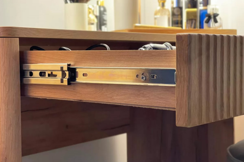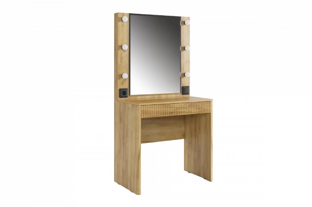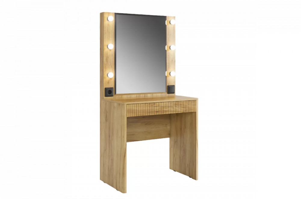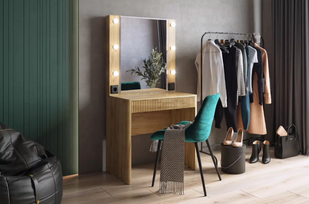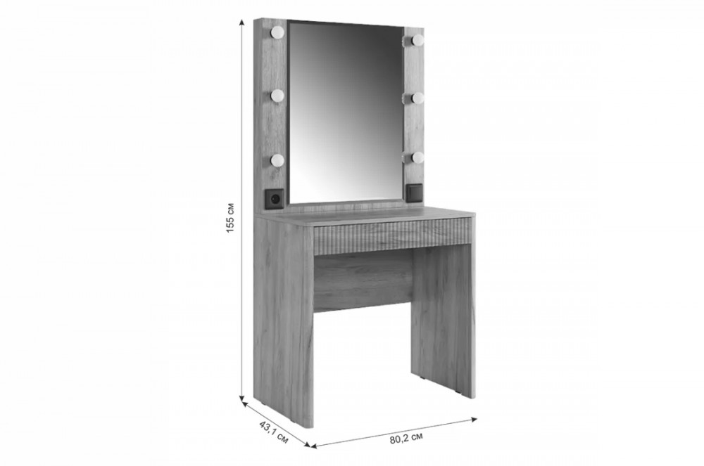 Трюмо Адам — это идеальное сочетание стиля и практичности. С широким фацетированным зеркалом, в котором встроена подсветка из 6 лампочек, оно создает атмосферу профессиональных студий визажистов прямо у вас дома. Комфорт и функциональность обеспечиваются дополнительными элементами, такими как выключатель, розетка для фена и выдвижной ящик для хранения украшений и косметики.